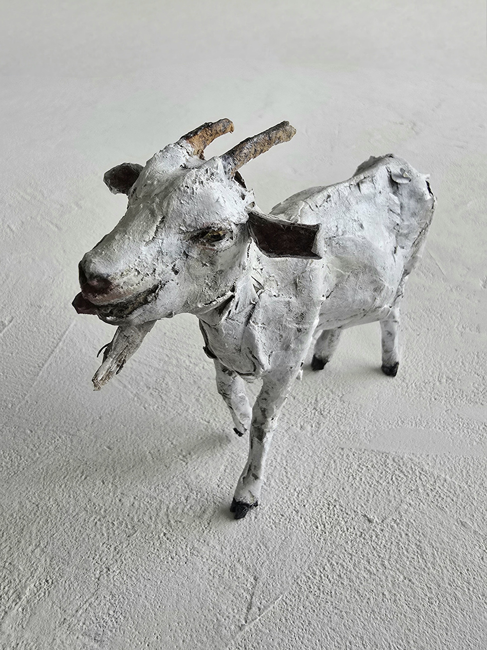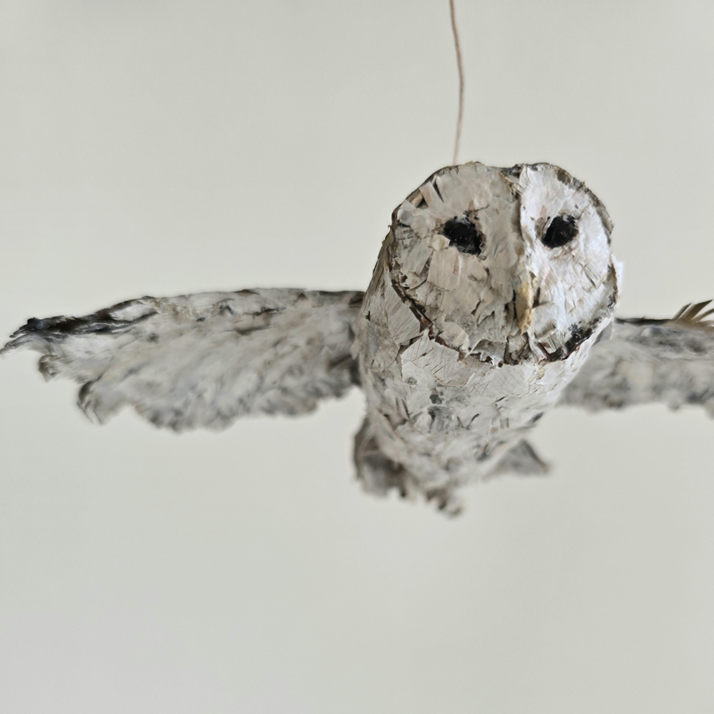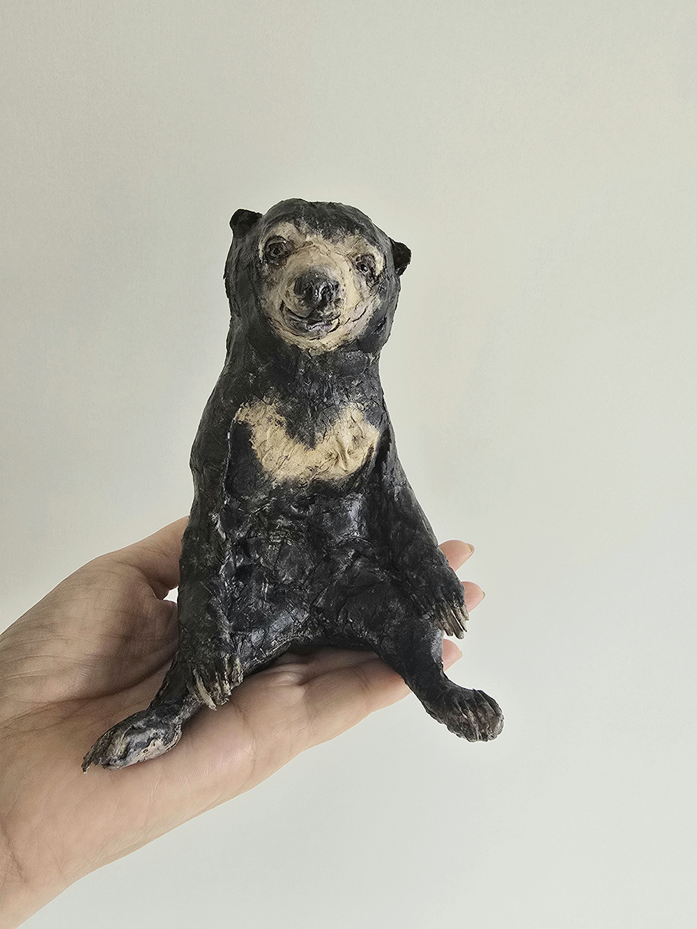 身近な紙、ダンボールや新聞紙を使い特別な作品を作りたいと思っています。好きな動物をカタチづくる事が多く、目が印象的だという感想を多く頂きます。小さな目め大きな目も黒目の部分が真っ直ぐで、うそのない目をしてる。本能のままに生きてるものの目は、かっこよくって、怖さ不気味さも感じる。そんな目を意識して見て頂けたら嬉しく思います。