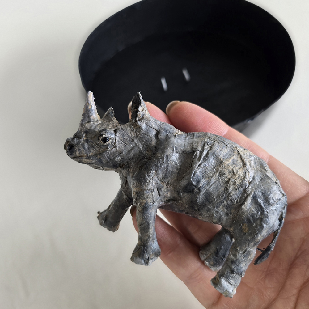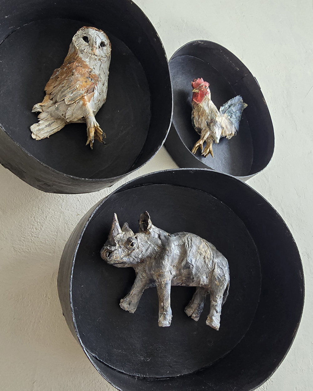 レイコさんは、ダンボールや新聞紙といった身近にある紙を素材として、動物などのオブジェをつくる作家。