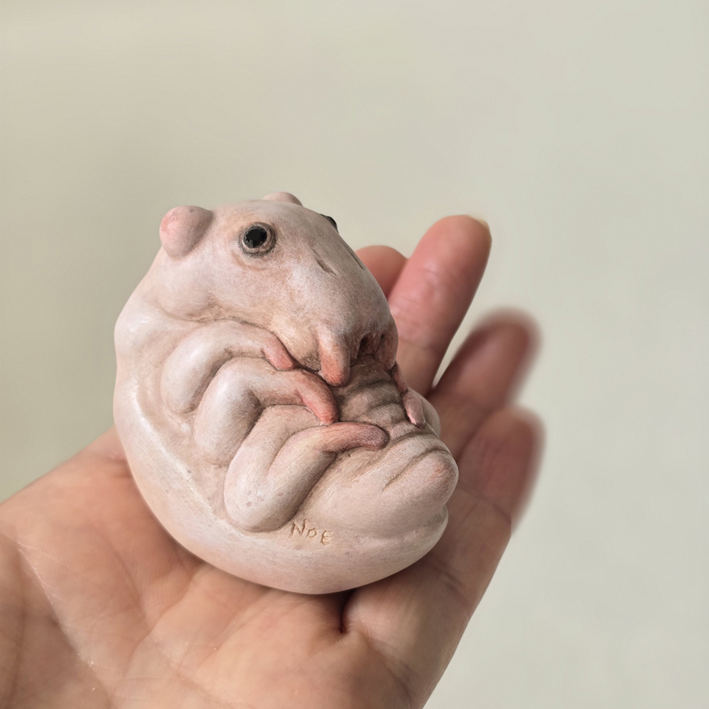 木粉やジェスモナイト・布などを使ってつくるNoeさんの作品は、私たちが知っているいきものと架空の生物を行ったり来たりをしている存在のようです。