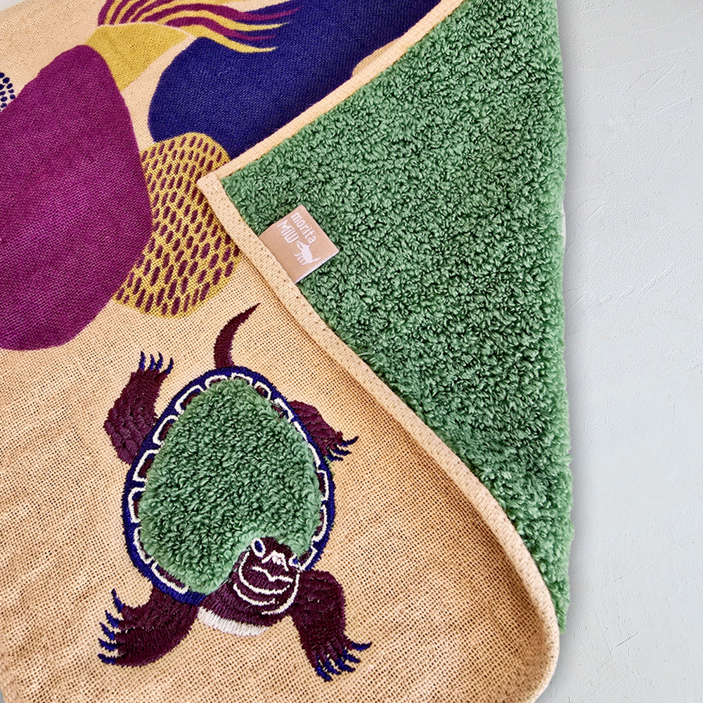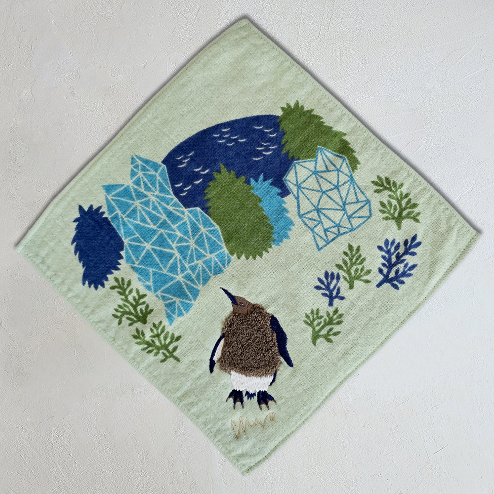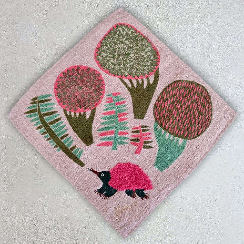 シルクスクリーンでプリントされた景色の中に、ボディがモコモコパイルと刺繍で描かれまるで小さなぬいぐるみのようなドウブツがいます。