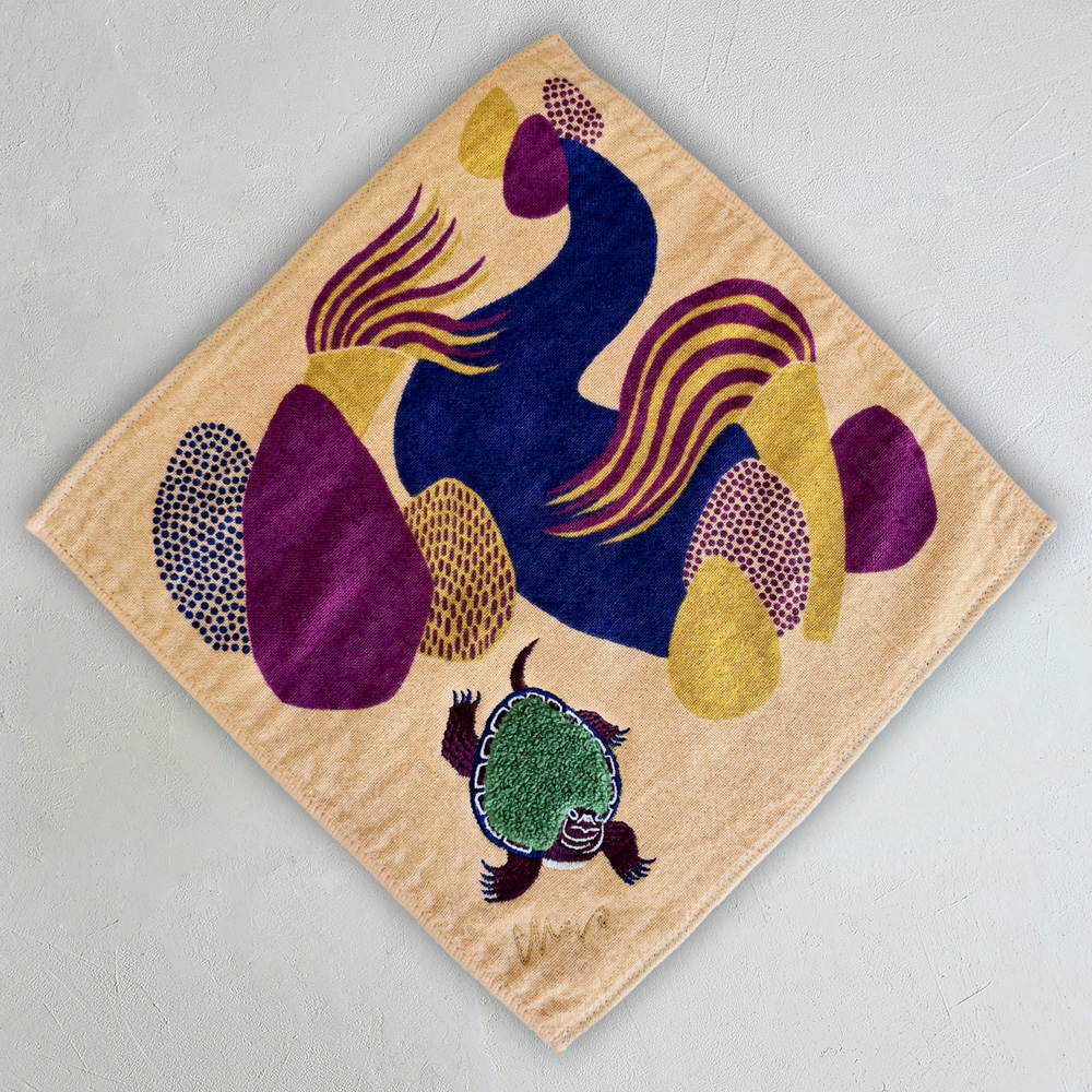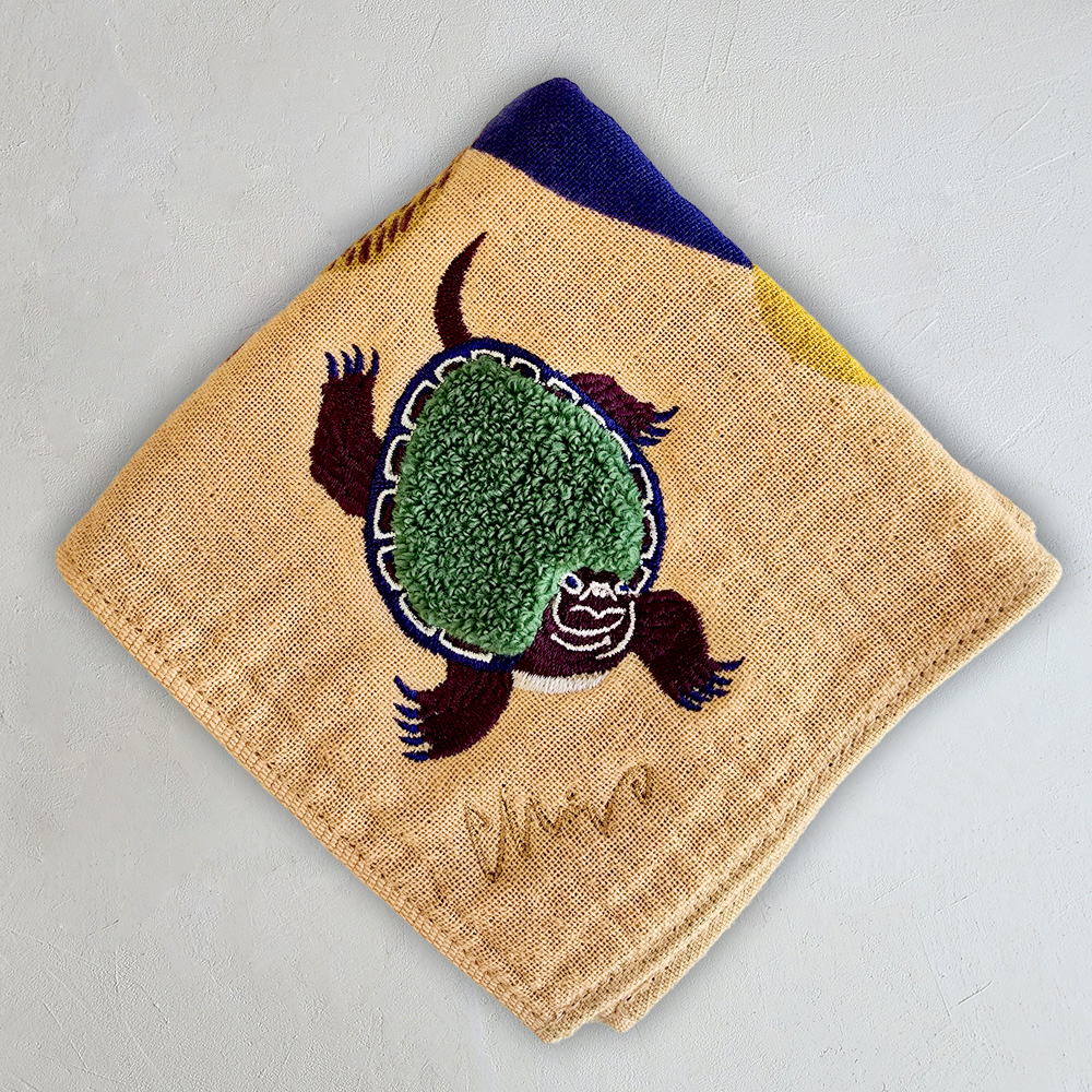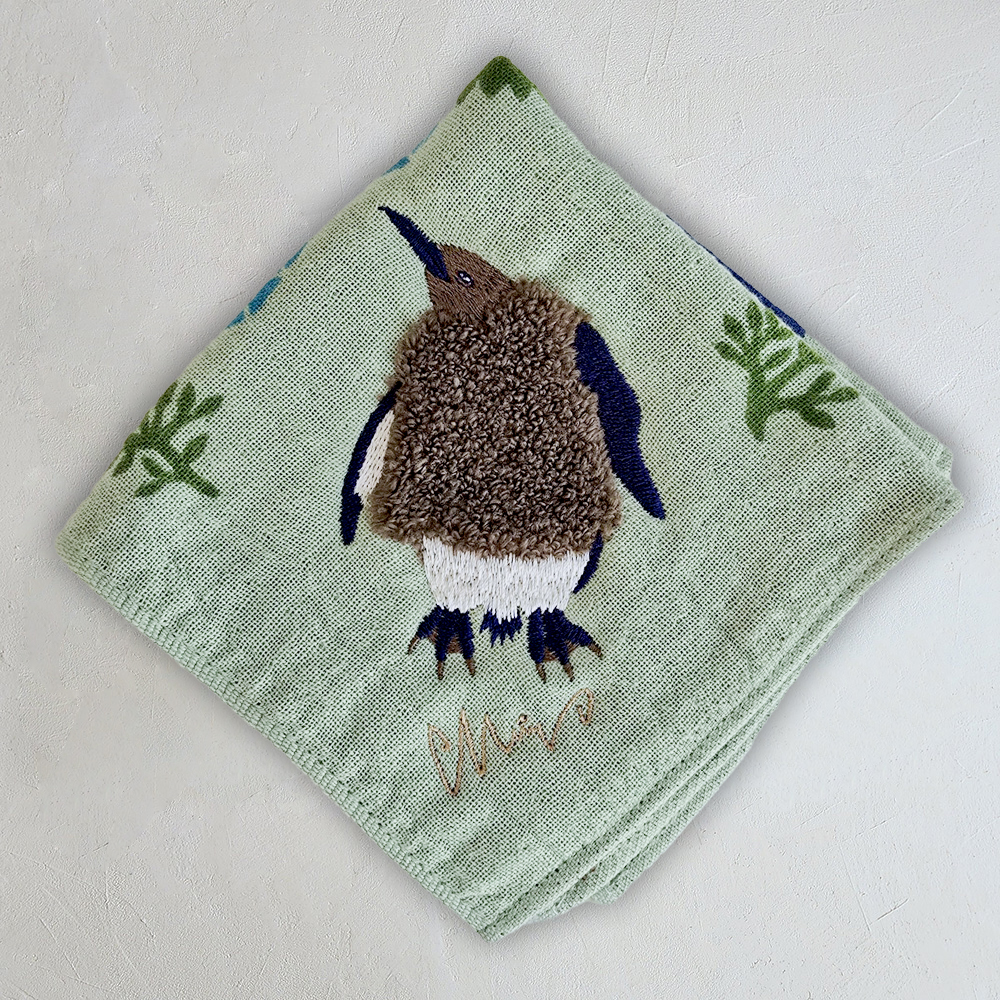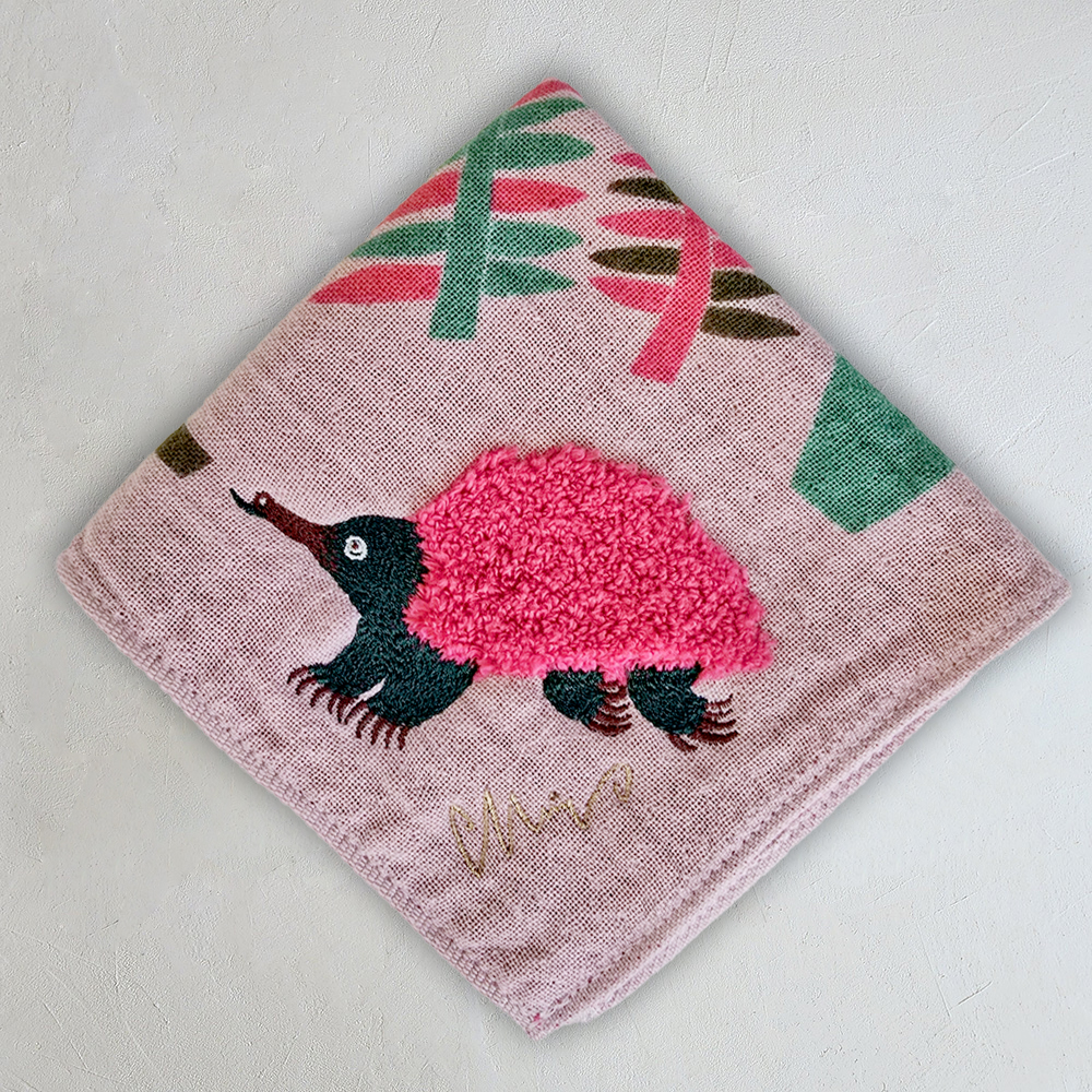 シルクスクリーンでプリントされた景色の中に、ボディがモコモコパイルと刺繍で描かれまるで小さなぬいぐるみのようなドウブツがいます。