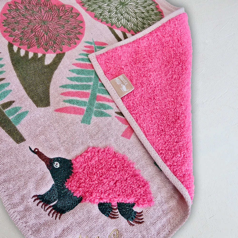 このハンカチは、表地ガーゼ裏地パイルのフカフカとボリュームあるハンカチ。
